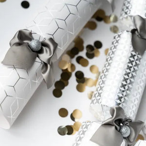 Add some sparkle to your festive table with this pack of Opulent Silver Geo Pattern Crackers. Featuring elegant designs, shimmering metallic accents. Each cracker hides a gift to impress, a cheeky joke, a party hat, and that satisfying snap that is perfect for celebrating in style.
