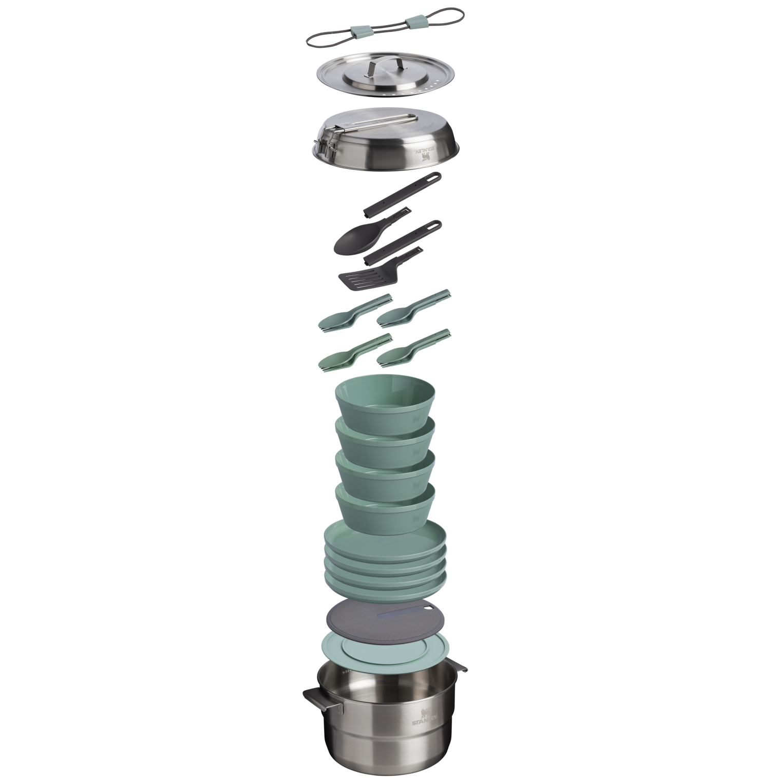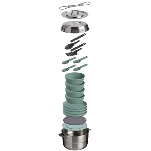 TheWildfare Core Fry PanCookset is afully stocked kitchen, packed up neatly to go. This 26-piece set includes a 4-quart pot, 8-inch tri-ply fry pan, cooking utensils, and nonslip cutting board with aremovabletrivet.The four-person tableware set includes high-walled plates, stacking bowls, and dual-end cutlery for outdoor hosting with the comfort of home.